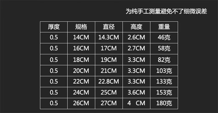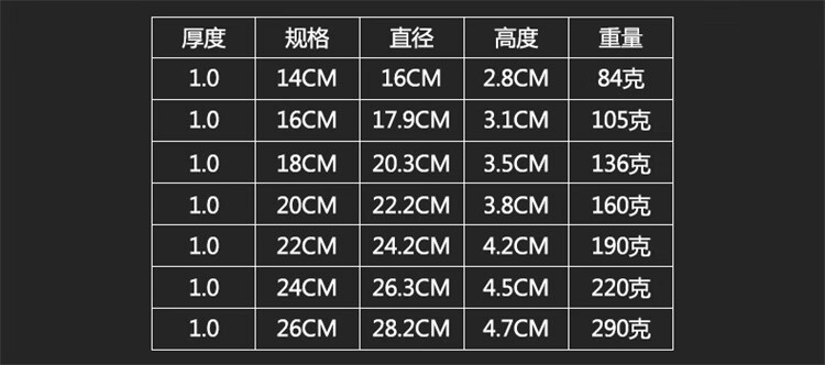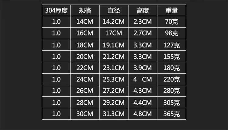 【20cm-1.0特厚304不銹鋼】-3個(gè) 【24cm-05加厚圓盤(pán)】-6個(gè) 【24cm-1.0特厚304不銹鋼】-3個(gè) 【26cm-1.0特厚304不銹鋼】-2個(gè) 【16cm-05加厚圓盤(pán)】-12個(gè) 【26cm-1.0特厚圓盤(pán)】-3個(gè) 【28cm-1.0特厚304不銹鋼】-2個(gè) 【18cm-1.0特厚圓盤(pán)】-6個(gè) 【14cm-1.0特厚圓盤(pán)】-9個(gè) 【30cm-1.0特厚304不銹鋼】-2個(gè) 【14cm-1.0特厚304不銹鋼】-5個(gè) 【22cm-1.0特厚圓盤(pán)】-5個(gè) 【16cm-1.0特厚圓盤(pán)】-8個(gè) 【18cm-1.0特厚304不銹鋼】-4個(gè) 【20cm-1.0特厚圓盤(pán)】-5個(gè) 【26cm-05加厚圓盤(pán)】-5個(gè) 【24cm-1.0特厚圓盤(pán)】-4個(gè) 【22cm-05加厚圓盤(pán)】-8個(gè) 【18cm-05加厚圓盤(pán)】-10個(gè) 【20cm-05加厚圓盤(pán)】-9個(gè) 【16cm-1.0特厚304不銹鋼】-5個(gè) 【14cm-05加厚圓盤(pán)】-15個(gè) 【22cm-1.0特厚304不銹鋼】-3個(gè)